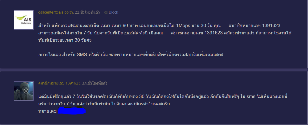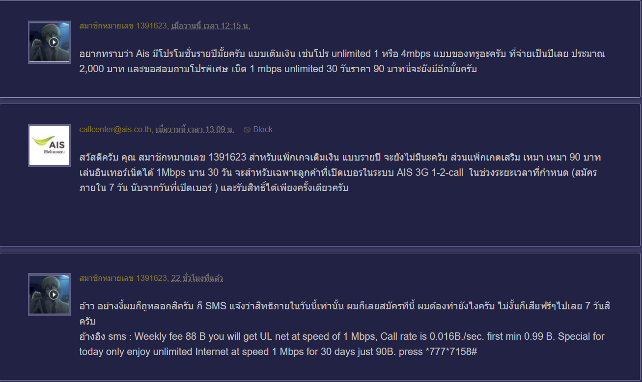 ก็เห็นๆอยู่ว่ามันทับกับครับ หรือผมเข้าใจผิด ไม่ได้เกี่ยวกับโปรโมชั่นหลักข้างบนนะครับ ตรง package เสริม Internet อันแรกคือได้มาจากการเปิดเบอร์ฟรี 7 วัน แต่อันที่สองคือที่ผมสมัครไป ถ้า SMS แจ้งตั้งแต่แรกว่าภายใน 7 วันผมจะไม่มีปัญหาอะไรเลย เพราะ วันที่ 7 ค่อยสมัครก็ได้ แต่นี่แจ้งว่าวันนี้เท่านั้น