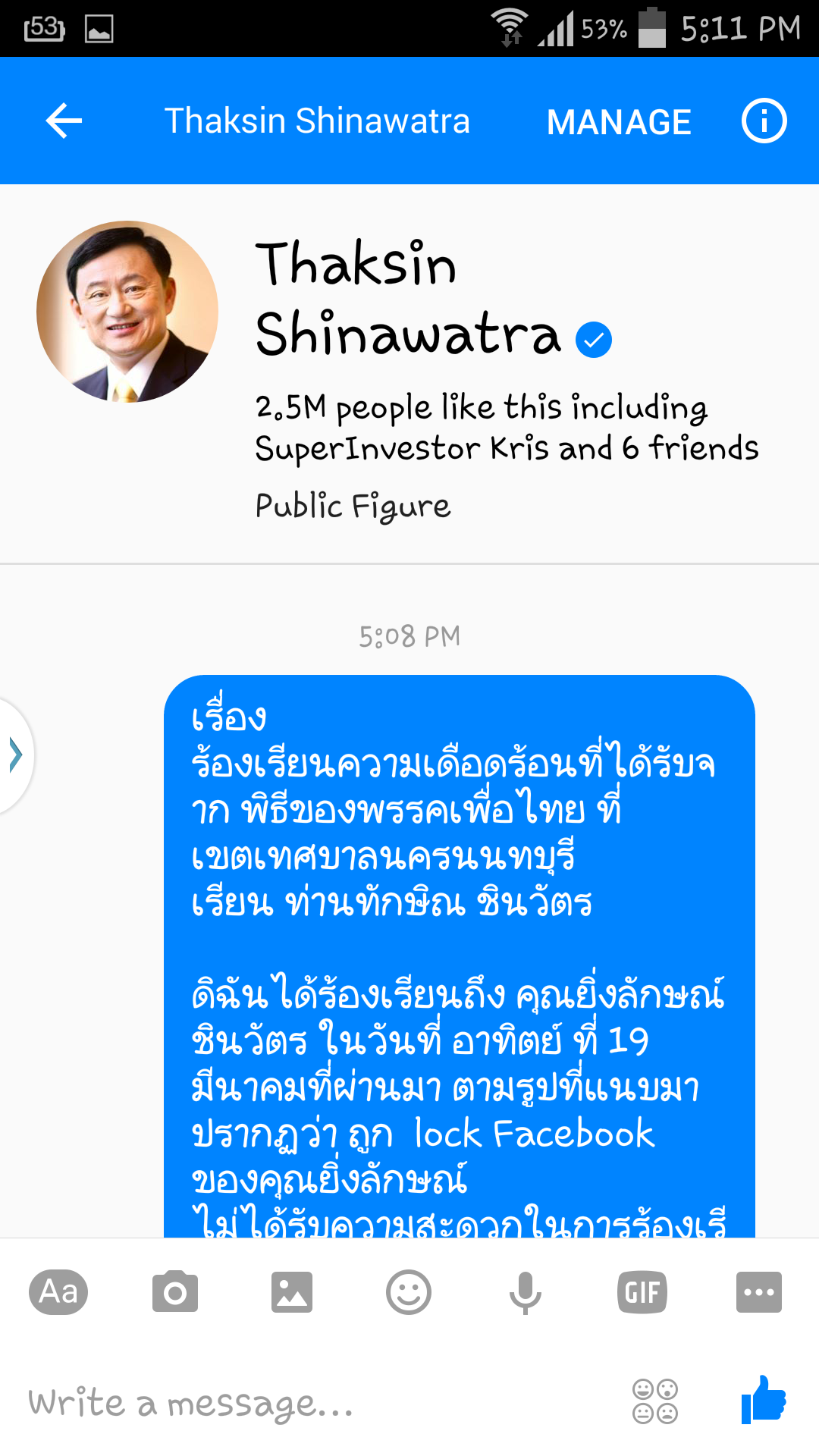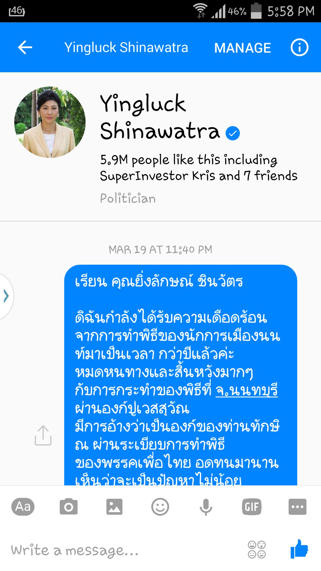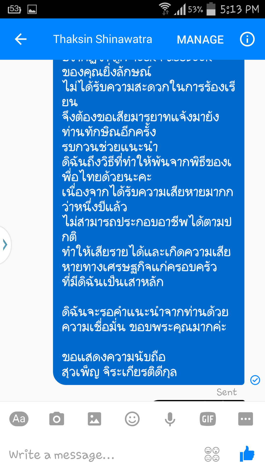 ดิฉันถูกทำร้ายร่างกาย จิตใจ ทารุณกรรม ทำให้ซึมเศร้าหนัก จนไม่สามารถประกอบอาชีพได้ สร้างความเสียหายให้เกือบสี่ล้านบาทแล้ว เป็นตัวเลขจากการประเมิน จนกระทั่งทุกวันนี้ ก็ยังไม่เลิกทำพิธีกับดิฉัน จนหมดความอดทน เล่าคร่าวๆ ไม่ละเอียดเพราะเยอะมาก ได้ทำการร้องเรียนผ่าน Face book ท่านยิ่งลักษณ์ ชินวัตร ก่อนไม่ได้รับความช่วยเหลือ จึงร้องไปอีกครั้งกับ ท่านทักษิณ ชินวัตร ทาง Face book เช่นเดียวกัน ผลเหมือนกัน ตามรูปข้างล่างนี้