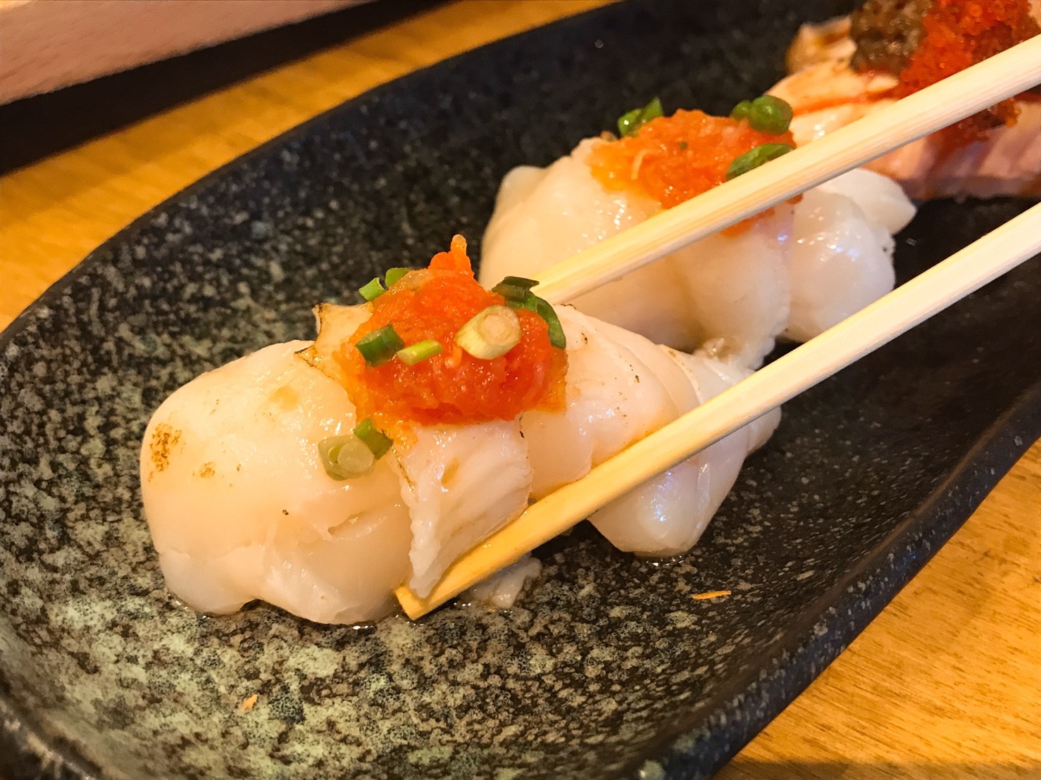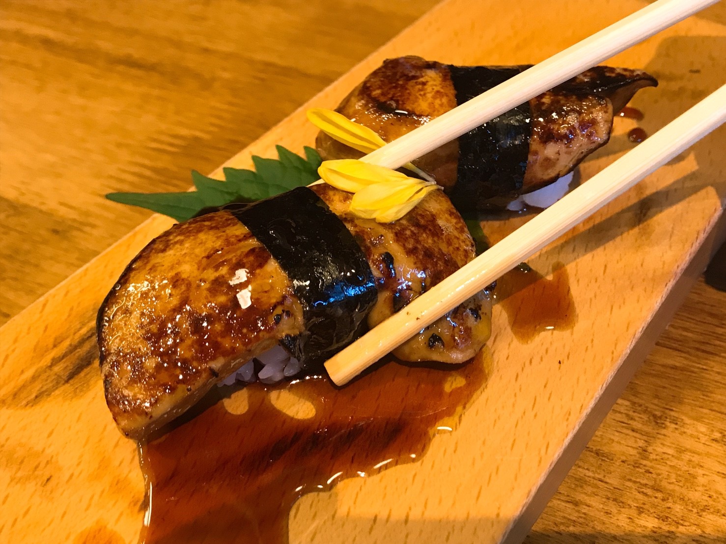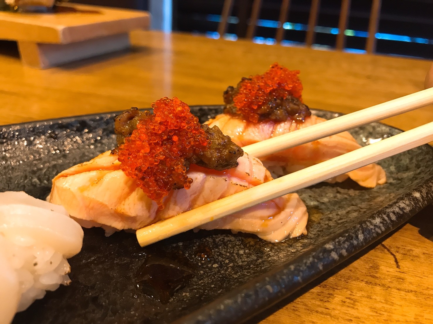 หงษ์พาไปเริ่มเมนูแรกกันเลยนะคะ Salmon foiegras sushi และ Hotate foiegras sushi