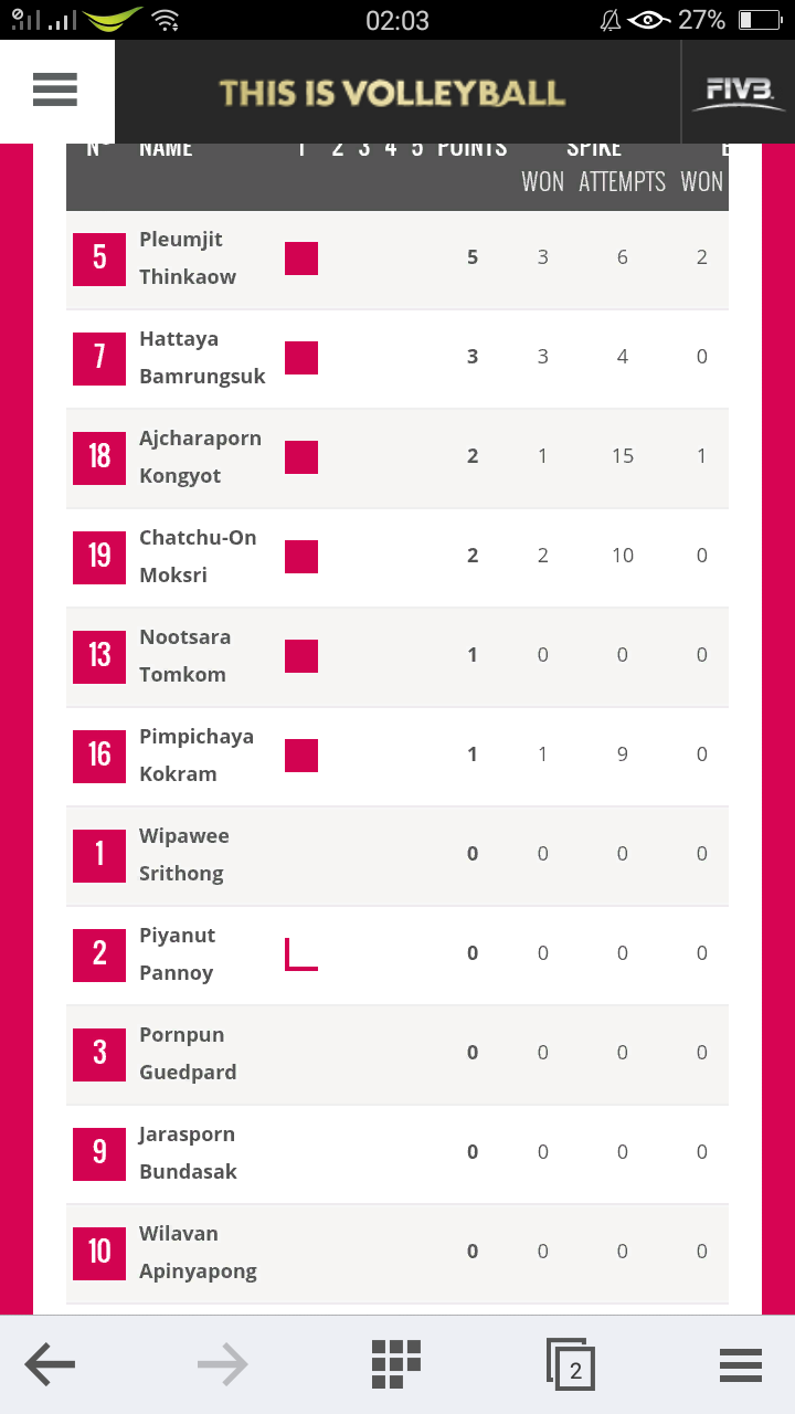 Oh1 กัปตัน ตบได้ 5 คะแนนจาก 20 ครั้ง (4/9เสาซ้าย + 0/6เสาขวา + 1/3สามเมตร) 25% error4(2เสาขวา+2เสาซ้าย) เสิร์ฟเอซ 2 แต้ม Oh2 เฟรเซอร์ ตบได้ 16 คะแนนจาก 25 ครั้ง (16/23เสาซ้าย + 0/2สามเมตร) 64% error3(