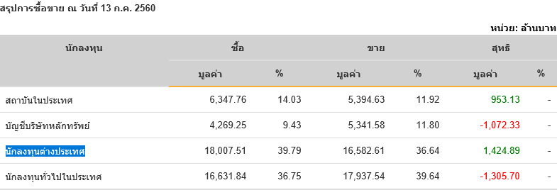 Sinthorn Summary 13/7/2560 : ต่างชาติซื้อสุทธิ 1,424.89 ลบ.