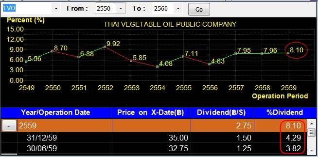 จากรูปนี้ %Dividend คิดจาก เงินปันผลแต่ละครั้ง / ราคาวันที่ขึ้น XD --> 3.82 + 4.29 = 8.10 ซึ่งตรงกัน
