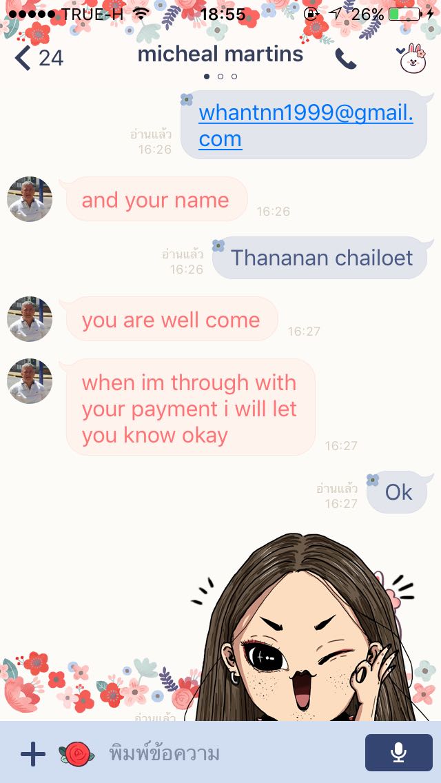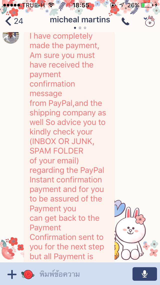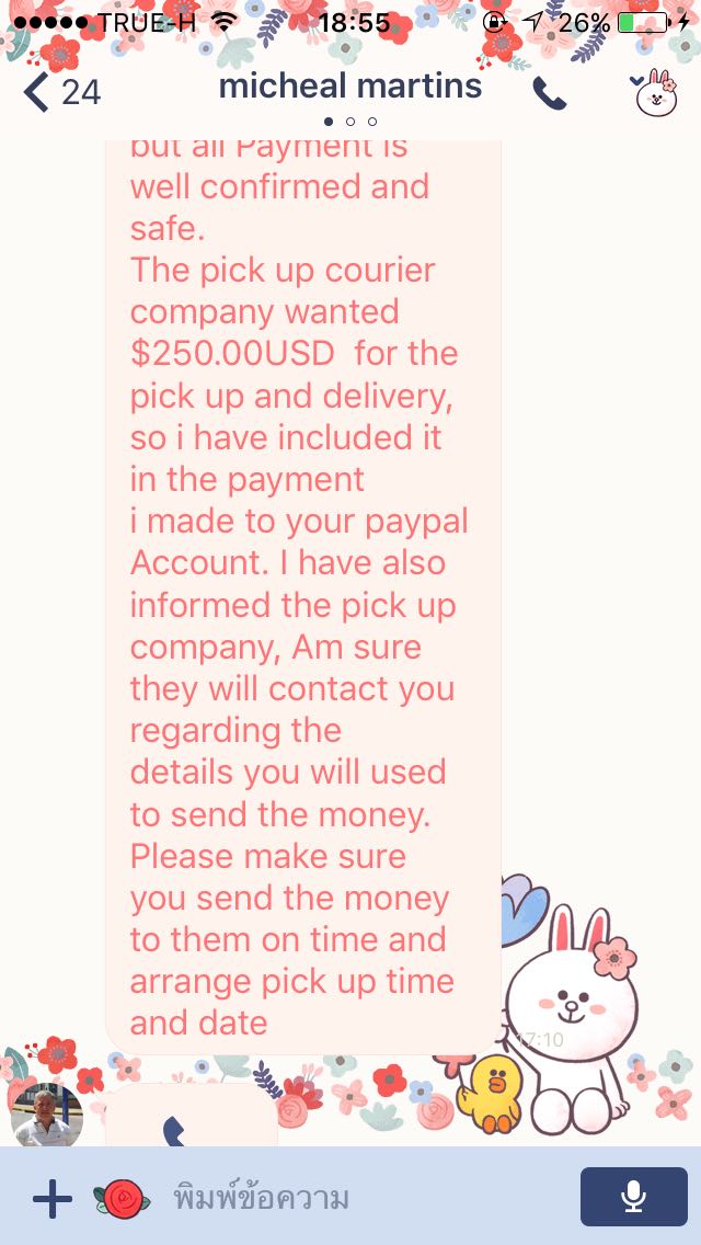 แล้วเราก็ส่งชื่อเรากับemailไปให้ฝรั่งคนนั้น สักพักเขาทักมาบอกว่าโอนแล้วให้เช็คว่ามีข้อความจากpaypalหรือemailมั้ย คือมันไม่มีอะไรแจ้งเตือนมาเลยค่ะ เราควรทำยังไงคะ แล้วเขาก็บอกว่าให้จ่าย 250usdก่อน เรางงมากจ่ายทำไม เราก็บอกเขาไปว่าไม่มีเงินเยอะขนาดนั้น