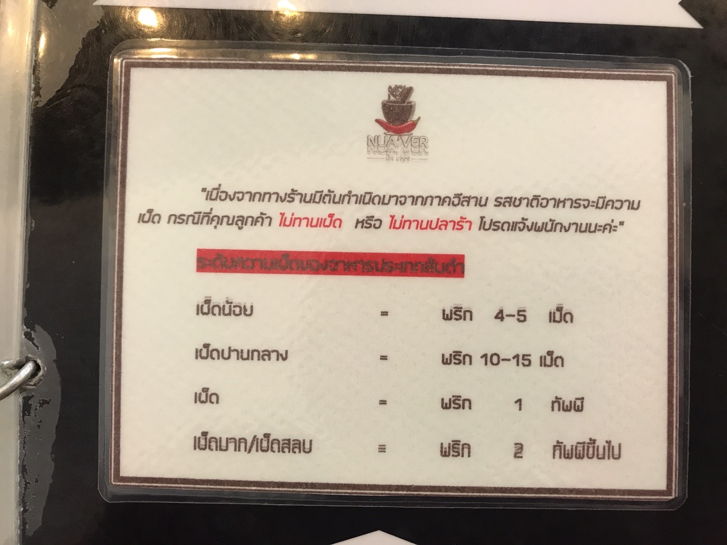 เพราะ ระดับความเผ็ดของร้านนี้ไม่เหมือนที่ไหนๆ บนโลก ก็ว่าได้เลยค่ะ บนปกมีระดับความเผ็ดให้เลือกค่ะ
