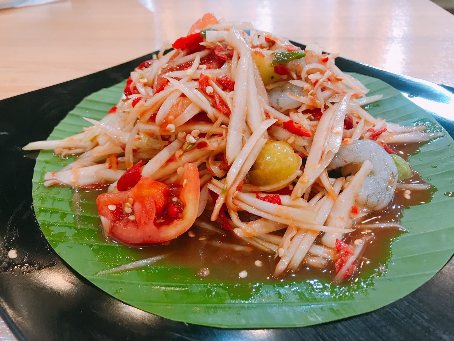 หน้าตาส้มตำเมนูแรกของเรา "ส้มตำกุ้งสด" ค่ะ