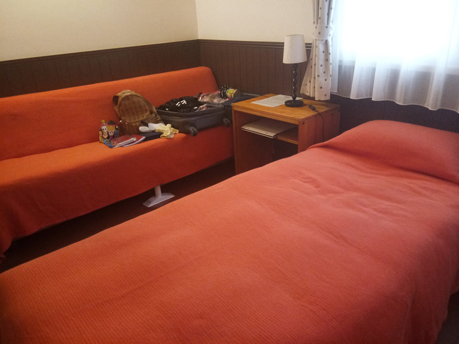 ขอกุญแจกับที่นอนก่อนได้ไหมคะ เจอแล้วที่นอนเรา เป็นห้องพักสี่คนคะ แต่เรามาสามคน ฉะนั้นที่นอนอีกอันก็จัดเป็นโซฟาไปคะ