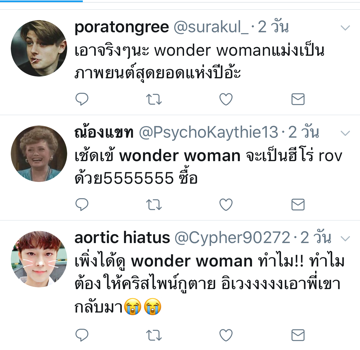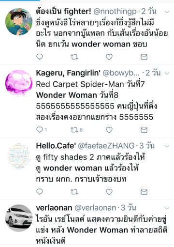สุดท้ายนี้ ในเมืองไทยหนังได้ลาโรงไปหลายวันแล้ว ลองมาดูความเห็นต่างๆจากคนภายนอก pantip ที่ได้ดู WW ในช่วง 2 วันนี้ ซึ่งแน่นอนว่าเขาเหล่านั้นไม่ได้ดูในโรง อาจจะหามาดูด้วยทางใดก็ทางหนึ่ง ก็ยังรักในตัวนาง ถ้าได้ดูในโรง รับรองว่าจะรักนางได้มากกว่านี้ ส่วนตัวผมนั้น ซัดไป 3 รอบในโรง จนต้องกลายเป็นติ่ง WW นับแต่นั้นมา