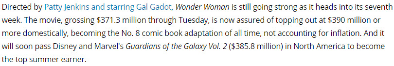 Hollywood Report รายงาน Wonder Woman จะทำเงินมากกว่าหนังซุปเปอร์ฮีโร่ช่วงซัมเม่อใดๆที่ผ่านมากว่า 15 ปี ในอเมริกา เป็นหนังช่วงซัมเม่อที่ประสบความสำเร็จมากที่สุด ซึ่งเหนือความคาดหมาย WW ยังคงเดินหน้าทำเงินอย่างต่อเนื่อง เมื่อเข้าสู่ สัปดาห์ที่ 7 ในตอนนี้ทำได้ 371 ล. และคาดว่า จะสามารถทำได้ถึง 390 ล. บวก ในบ้าน จะทำให้รายได้แซง Guardians of the Galaxy Vol. 2 ที่ 385 ล. ยังไม่นับรวมรายได้ WW ที่กำลังจะฉายในญี่ปุ่น (คาดว่าในญี่ปุ่น จะได้ไม่ต่ำกว่า 80 ล. แน่นอน ความเห็นส่วนตัว )