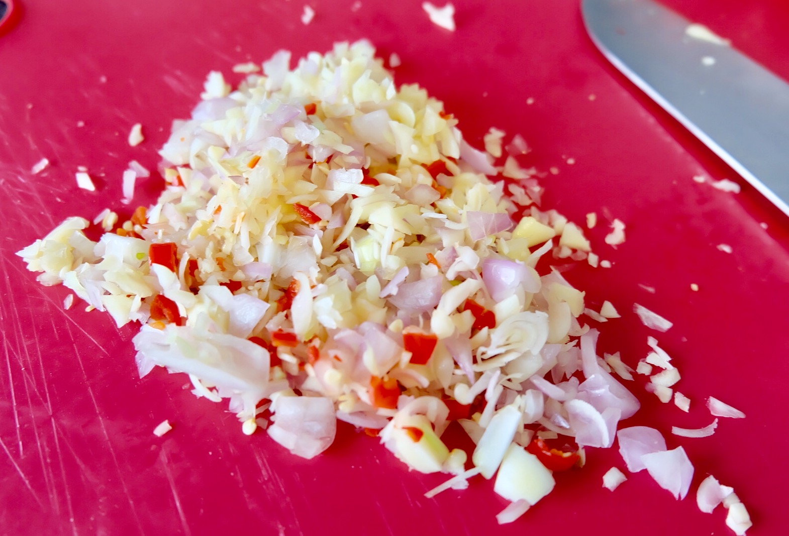 อ่อ ถ้ามีครก เอาไปโขลกรวมกันจะเร็วกว่านะคะ ตอนนั้นเราไม่มีเลยสับ ๆ รวมกันค่ะ