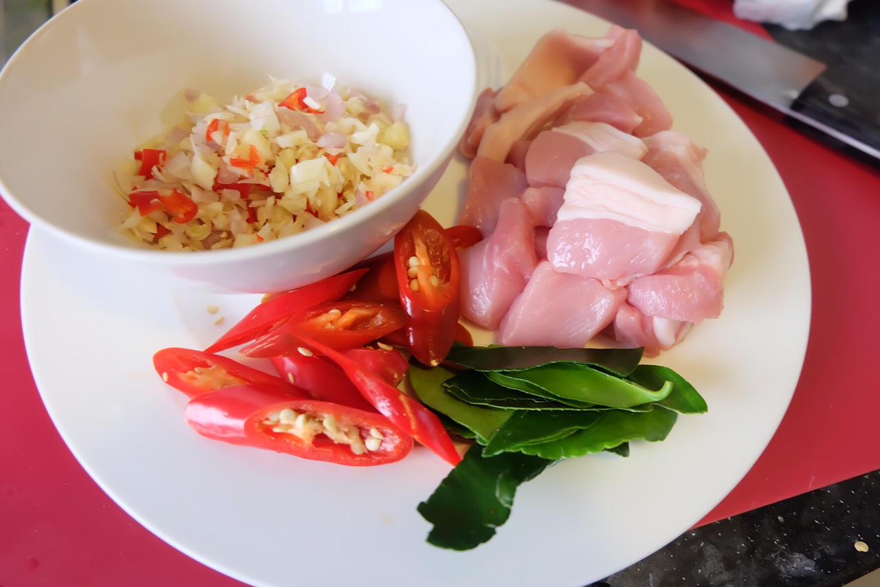 หั่นหมูเป็นชิ้นพอคำ สไลซ์พริกชี้ฟ้า และฉีกใบมะกรูดรอได้เลยค่ะ