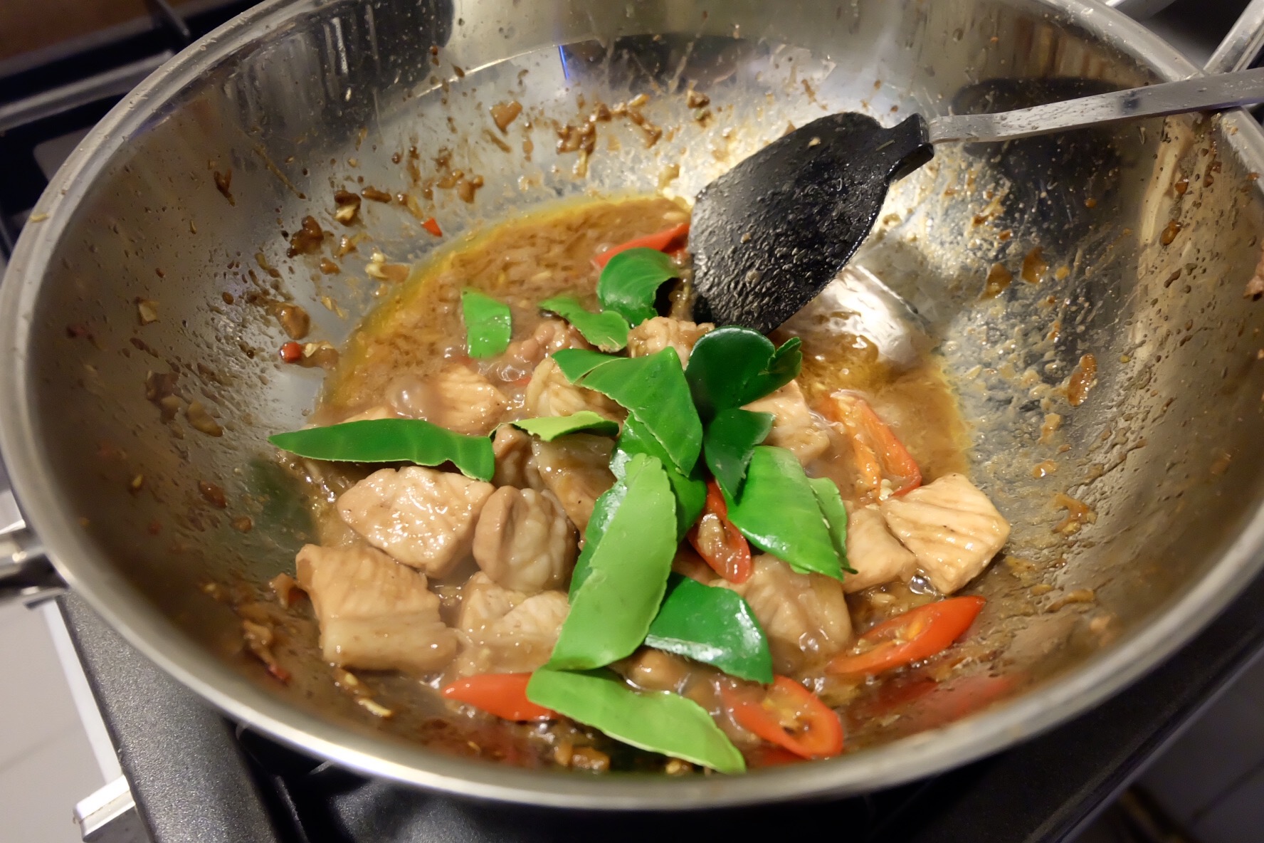 3. พอส่วนผสมเข้ากันดี ใส่พริกชี้ฟ้า และใบมะกรูดลงไป ผัด ๆ ให้เข้ากันซะหน่อย เป็นอันว่าเสิร์ฟได้ค่ะ