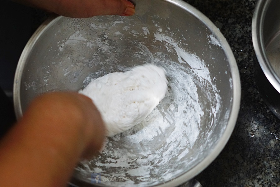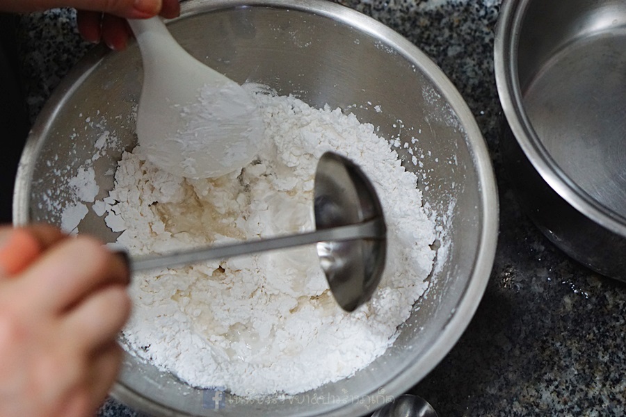 2.เทแป้งใส่ภาชนะที่เตรียมไว้ แล้วค่อยๆเทน้ำที่ต้มไว้ พร้อมกับนวดแป้งไปเรื่อยๆ ย้ำนะครับ ค่อยๆหยอดน้ำแล้วนวดไปพร้อมๆกันจนแป้งเป็นก้อน ถ้าเปียกไปเติมแป้ง ถ้าแห้งไปเติมน้ำร้อน นวดจนแป้งเป็นเนื้อเดียวกัน