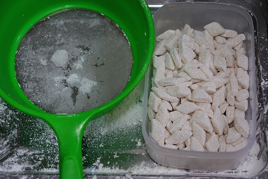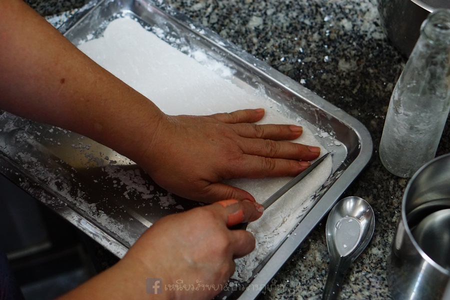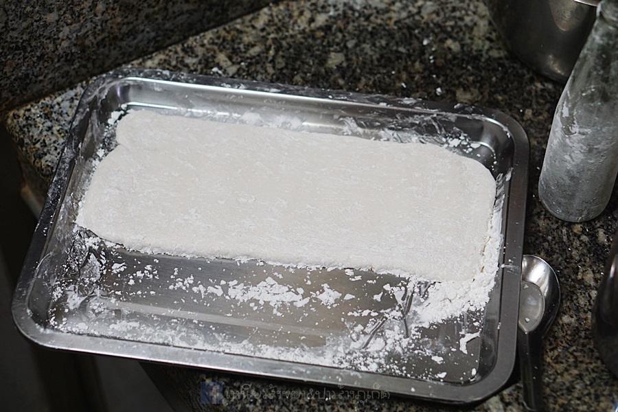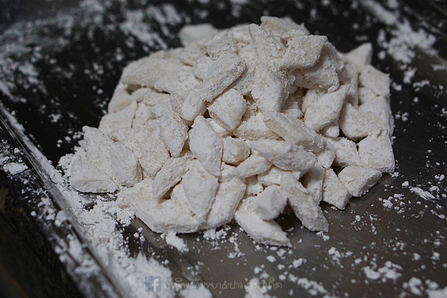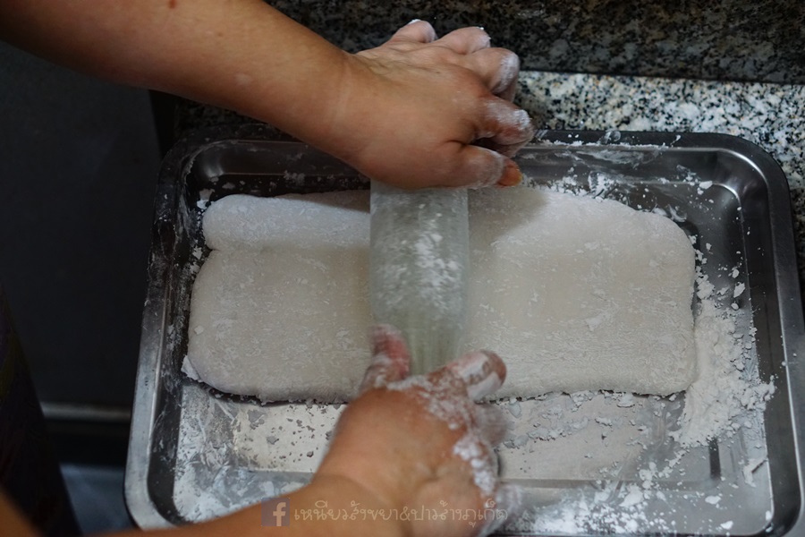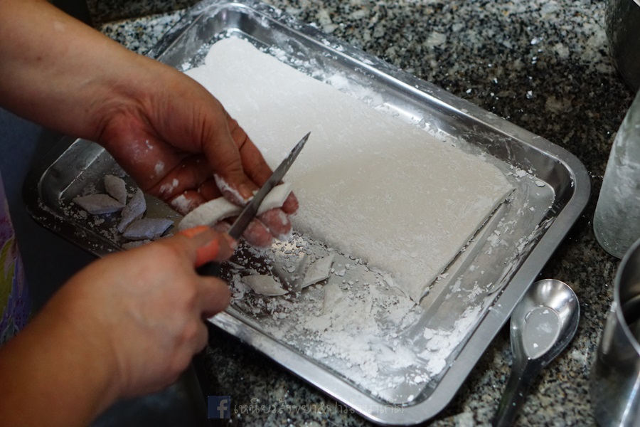 3.ใช้ขวดกลมๆแผ่แป้งเป็นแผ่นกะเอาให้ไม่บางเกินไป หรือหนาไป โรยแป้งบางๆไม่ให้ติดมือติดมีด แล้วตัดเป็นก้อนสี่เหลี่ยมข้าวหลามตัดเท่าๆกัน โรยแป้งเล็กน้อยเพื่อไม่ให้แป้งที่ตัดพักไว้ติดกันเป็นก้อน