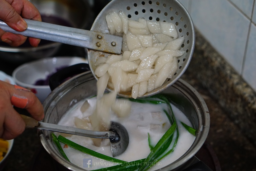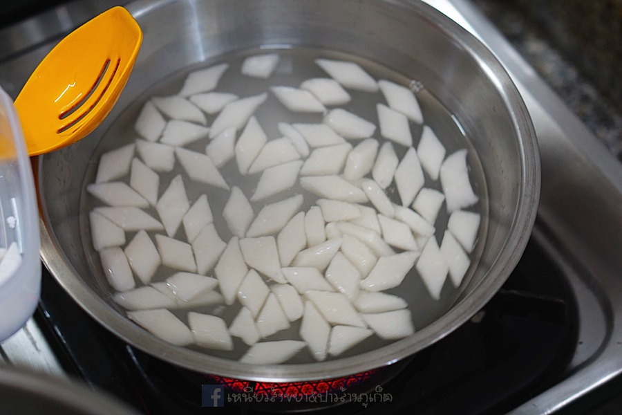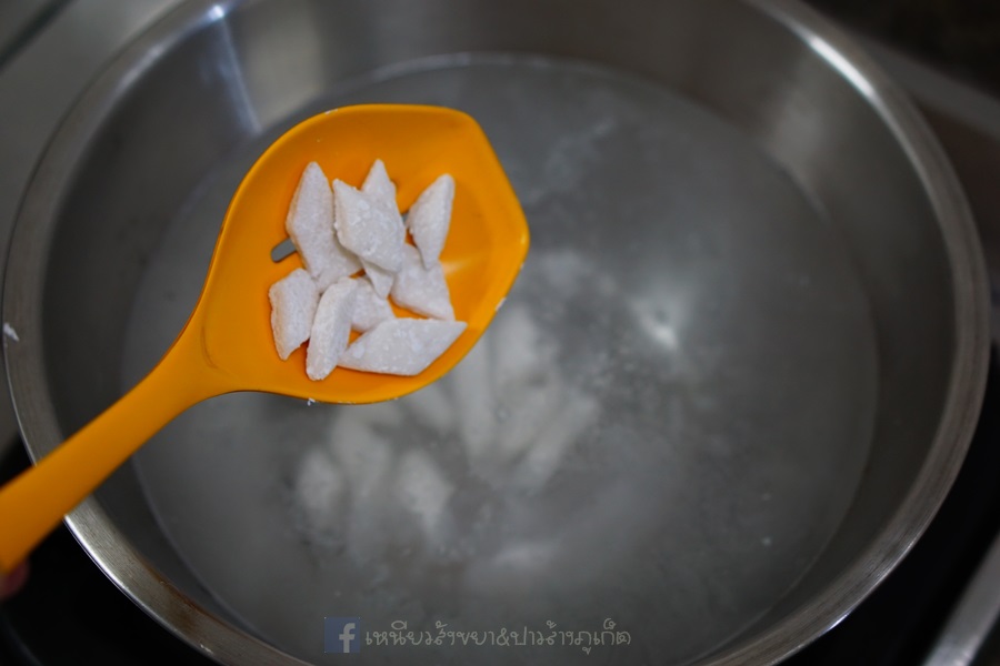 4.ตั้งน้ำให้เดือดอีกรอบ ร่อนแป้งส่วนเกินออก ใส่เม็ดแป้งลงไปในน้ำเดือด แป้งที่สุกแล้วจะลอยขึ้นมา ต้มซัก 1-2 นาที ตักเม็ดแป้งที่ลอยผิวน้ำใส่ในภาชนะที่มีน้ำอุณภูมิห้อง พักไว้