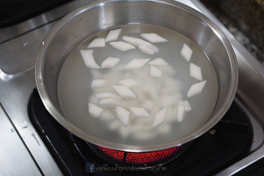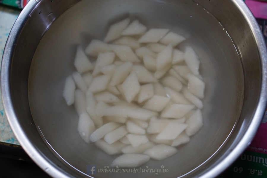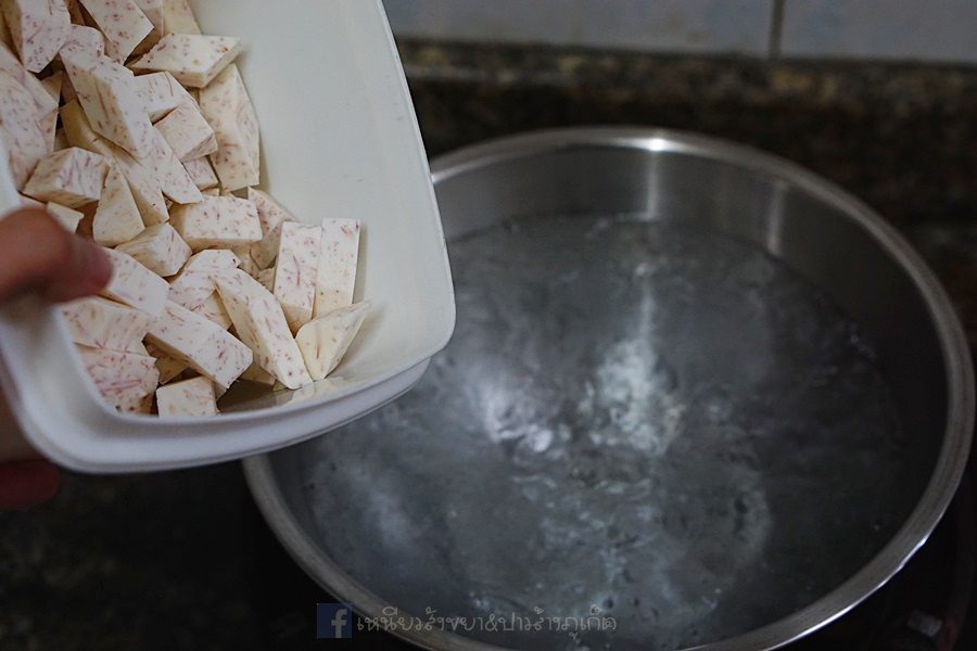 1.หัวบอน (เผือก) 1หัว หั่นเป็นชิ้นเล็กๆสี่เหลี่ยมข้าวหลามตัด