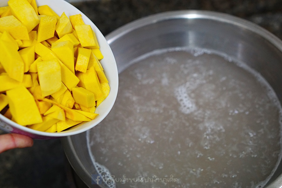 4.น้ำเต้า (ฟักทอง) 1ซีก หั่นเป็นชิ้นเล็กๆสี่เหลี่ยมข้าวหลามตัด