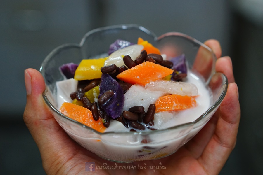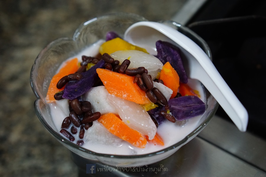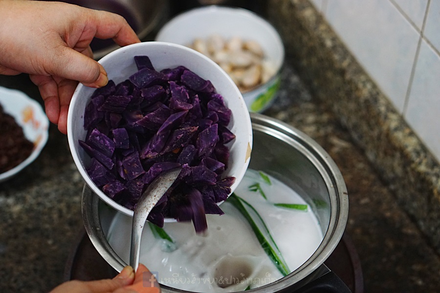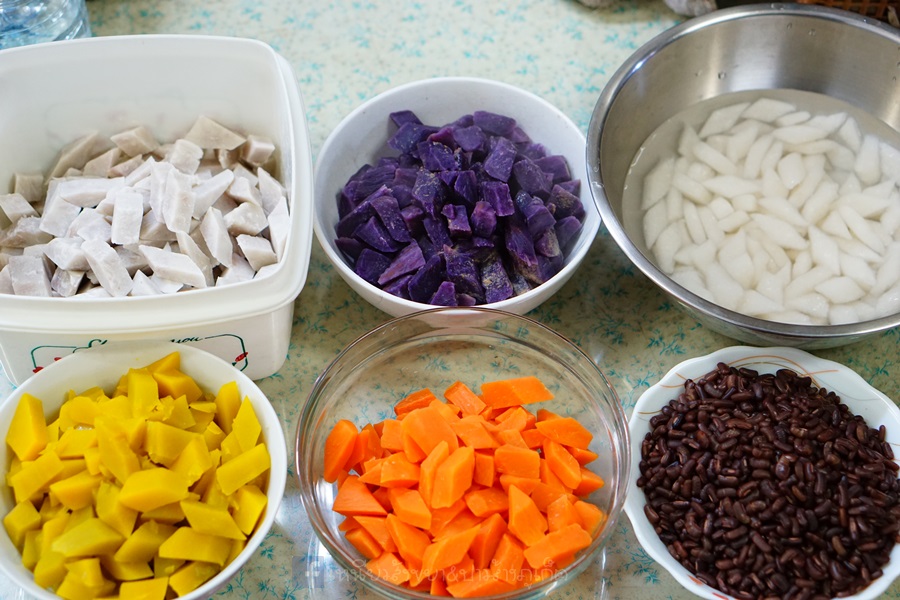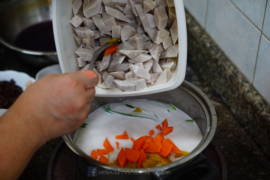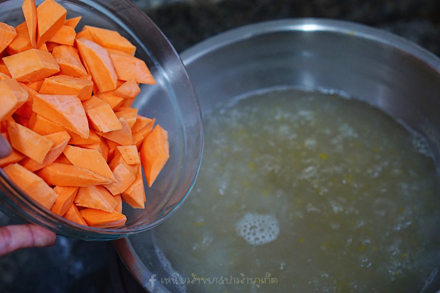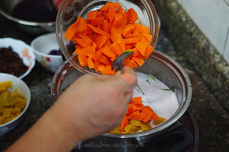 ทีละอย่างตามความเข้มของสีดังนี้ เผือก > ฟักทอง > มันเทศ > มันม่วง ให้สุกพอดีๆ ข้อนี้ต้องอาศัยความชำนาญในการชิมต้องต้มไม่ให้เปื่อยจนเกินไป