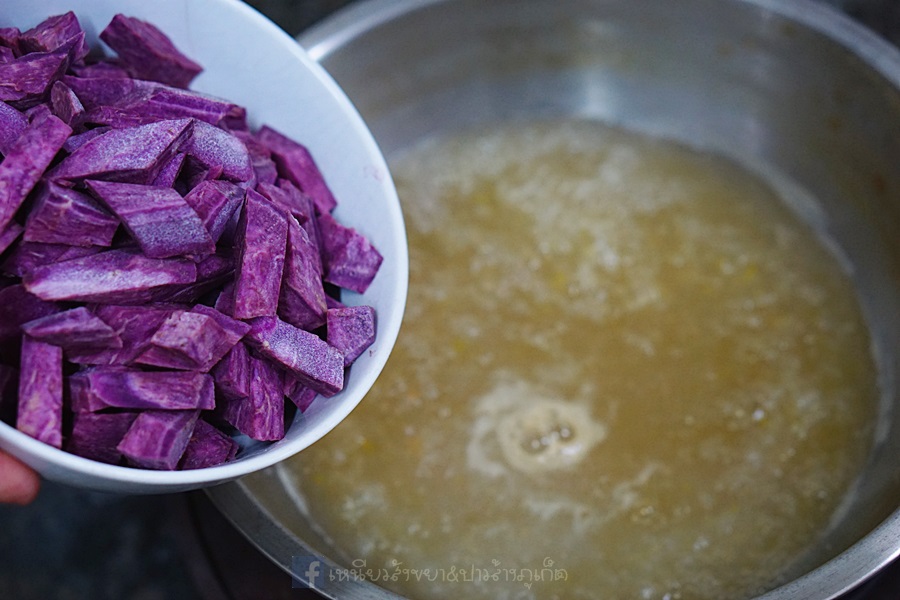 3.มันม่วง (มันต่อ) 1หัว หั่นเป็นชิ้นเล็กๆสี่เหลี่ยมข้าวหลามตัด