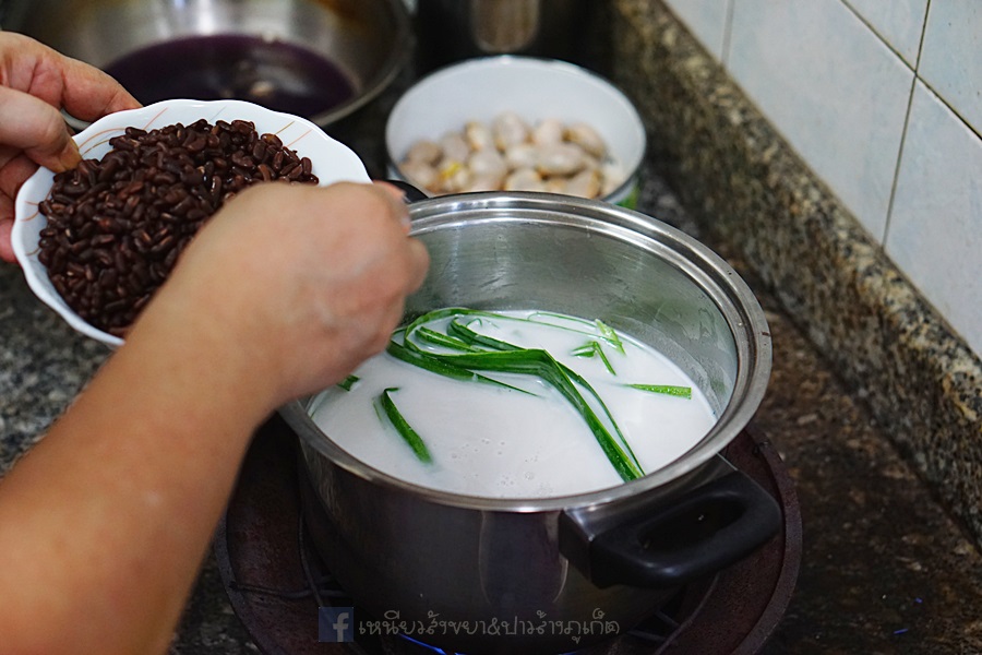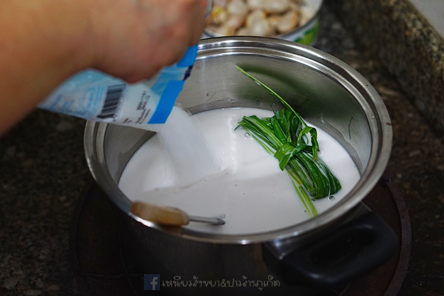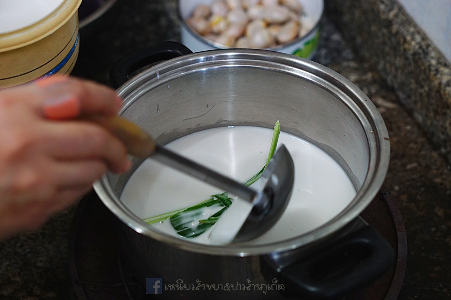 1.ใส่หัวกะทิ ใบเตย ลงหม้อตั้งไฟปานกลาง