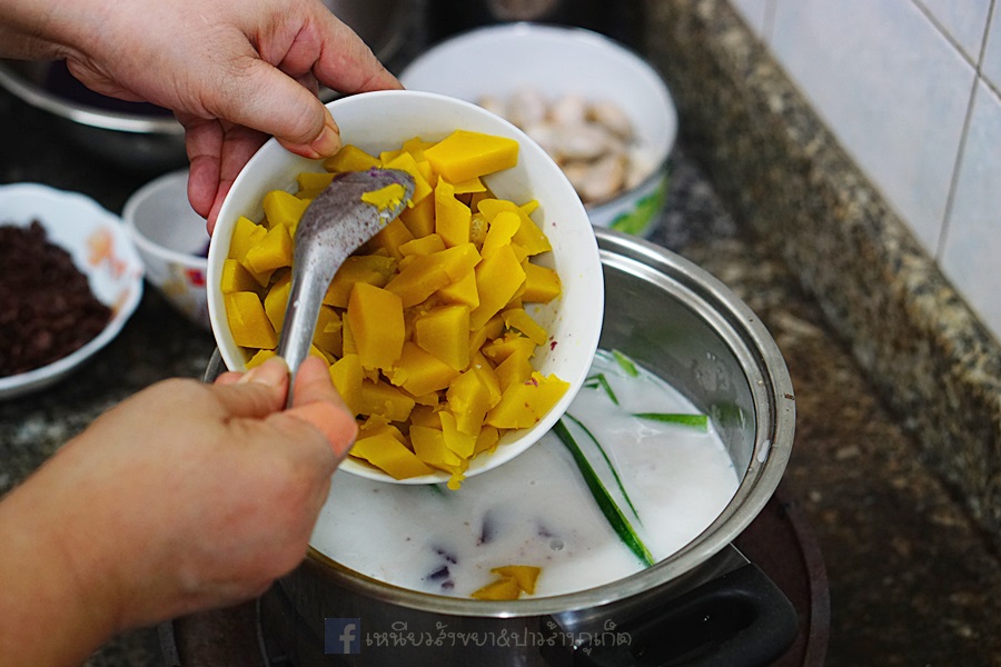 2.ค่อยๆใส่ทุกอย่างที่เตรียมไว้ลงหม้อ ในข้อนี้ สี่สหายของเรา เผือก มัน ฟักทอง ถ้าต้มเปื่อยจนเกินไป ขั้นตอนนี้บอกได้คำเดียวครับ เละ!!