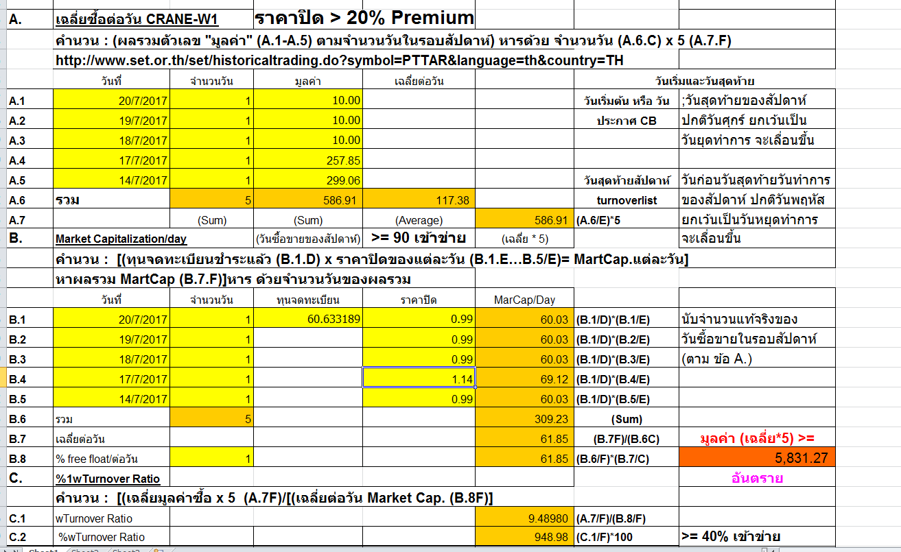 crane-w1 มีจำนวนหุ้นหมุนเวียนเพียง 60 กว่าเล็กน้อยล้านหน่วย และด้วยความร้อนแรงของราคาเล่นๆเกิน 20% Premium รวมถึงมูลค่าซื้อถึงวันนี้ 17/7/2560 เฉลี่ยต่อวัน >100 ล้านบาท ถึงแม้ยังเหลืออีก 3 วันแทบไม่มีความหมาย ตามหลักเกณฑ์ crane-w1 ตัวมันเองเข้าข่ายทั้ง 3 หลักเกณฑ์โดน Cash เริ่ม วันจันทร์ 24/7/2560 เป็นเวลา 6 สัปดาห์ ยกเว้นจะโดนสอยกลางอากาศด้วยมาตรการ Trading Alert เสียก่อน อย่างไรก็ตามต้องติดตามดู "ดุลยพินิต" ตลท จะออกมาอย่างไร เพื่อความปลอดภัยเล่นด้วยความระมัดระวัง เล่นตามจ้าวปลอดภัยที่สุด
