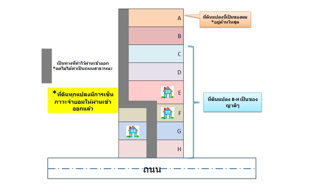เนื่องจากว่าทางครอบครัวของคุณแม่ผมพึ่งเสร็จสิ้นการแบ่งแยกที่ดินเสร็จนะครับ และที่ดินของผมนั้นอยู่ด้านในสุด (ที่ดิน A) และทุกคนได้ลงความเห็นกันว่าจะทำถนน(เส้นทางสีเทา) ดังรูปนะครับ และได้มีการเซ็นต์ในส่วนของภาวะจำยอมให้ผ่านเข้าออกของทุกแปลงเป็นที่เรียบร้อยแล้วนะครับ