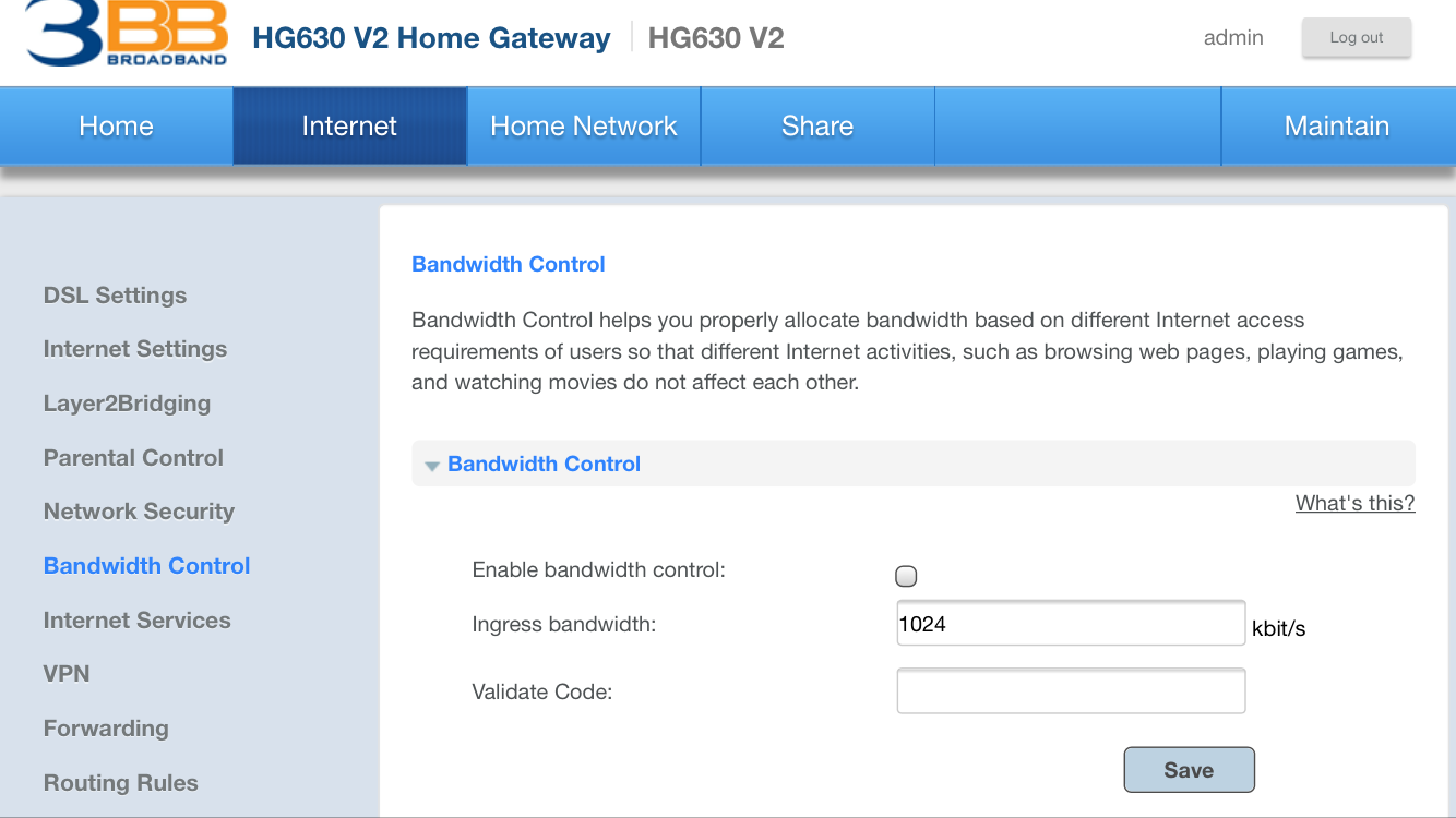 ที่บ้านใช่เน๊ตของ 3BB ครับ ใช้ Router 3BB HG630 V2 อยุ่ครับ ซึ่งลองทำดูแล้วไม่สามารถทำ Bandwidth Control ได้ครับ ยังไงช่วยแนะนำหน่อยครับ ว่ามีตัวไหนสามารถทำได้บ้างครับ
