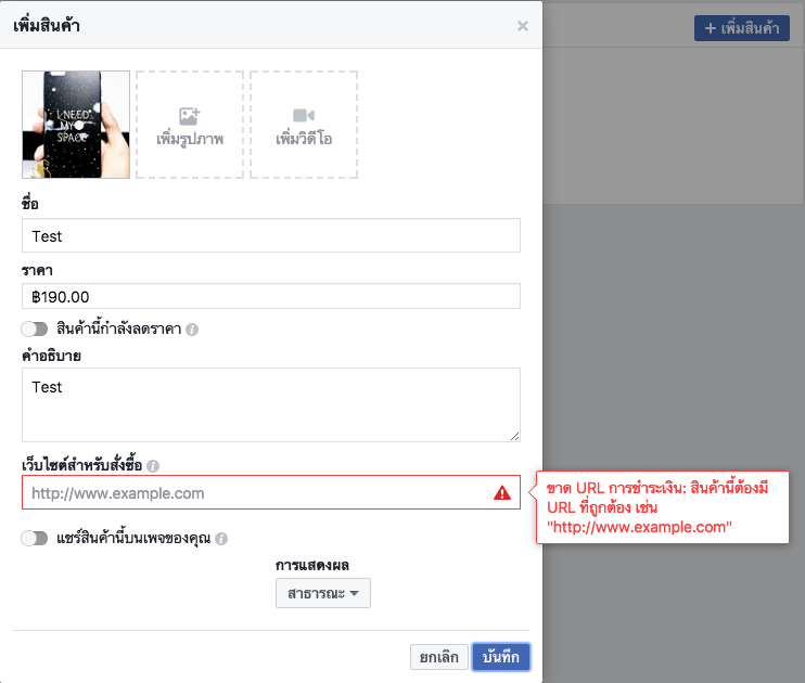 คราวนี้ติดปัญหาตรงที่ถ้าผมไม่กรอกข้อมูลตรงลายละเอียดช่อง "เว็บไซต์สำหรับสั่งซื้อⓘ" แล้วทำให้ไม่สมารถตั้งโพสต์ขายสินค้าได้เลยครับ
