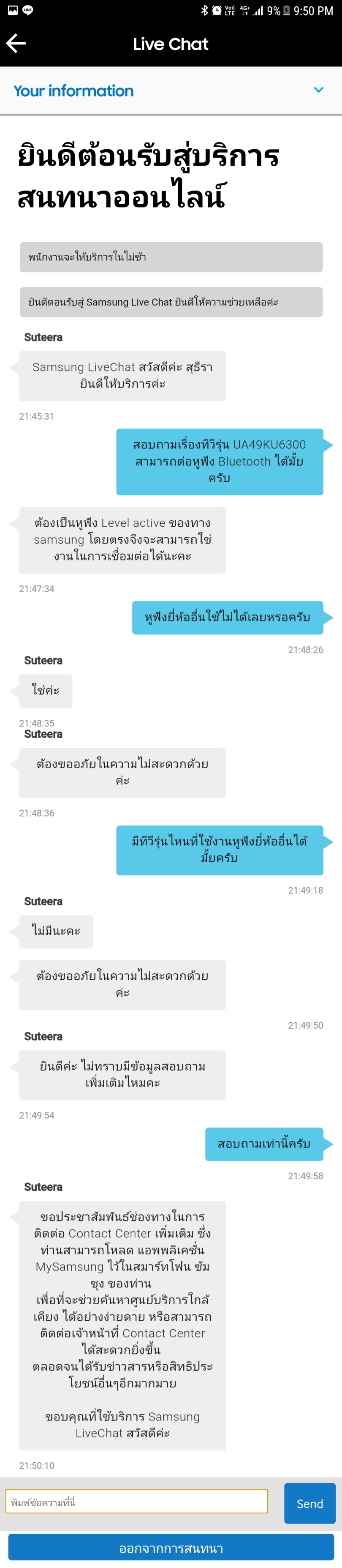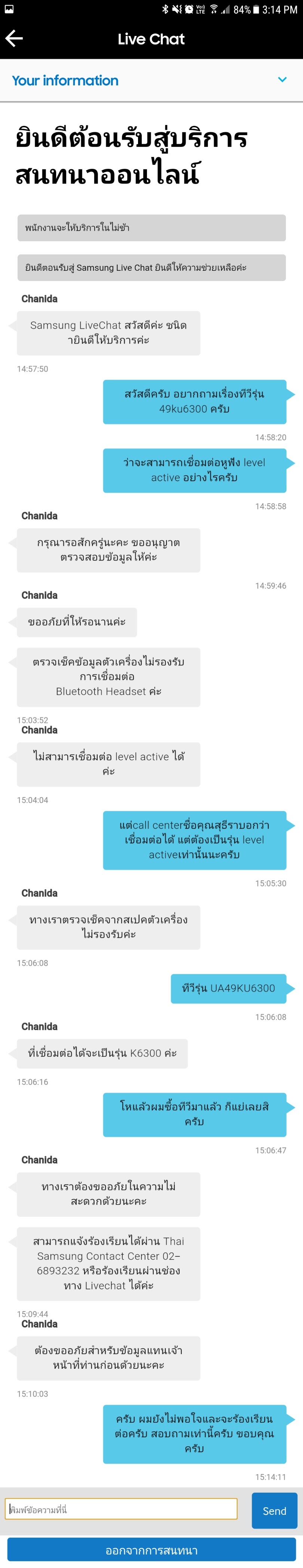 เรื่องคือผมอยากซื้อทีวีใหม่ครับ ก็อยากลองทีวีจอโค้งดูบ้างว่าจะเป็นยังไง เจอรุ่น UA49KU6300 เห็นว่าราคาไม่แพงจนเกินไปแต่ยังไม่ค่อยแน่ใจ spec เลยสอบถามไปยังซัมซุงผ่านแอพ mysamsung ว่าทีวีรุ่นนี้มันต่อหูฟัง Bluetooth ได้มั้ยเพราะบางทีอยากจะฟังเพลงดูหนังดังๆบ้างแต่เกรงใจคนอื่นๆในบ้าน พนักงานซัมซุงก็บอกว่าต่อได้แต่ต้องเป็นรุ่น Level active ของซัมซุงเท่านั้น