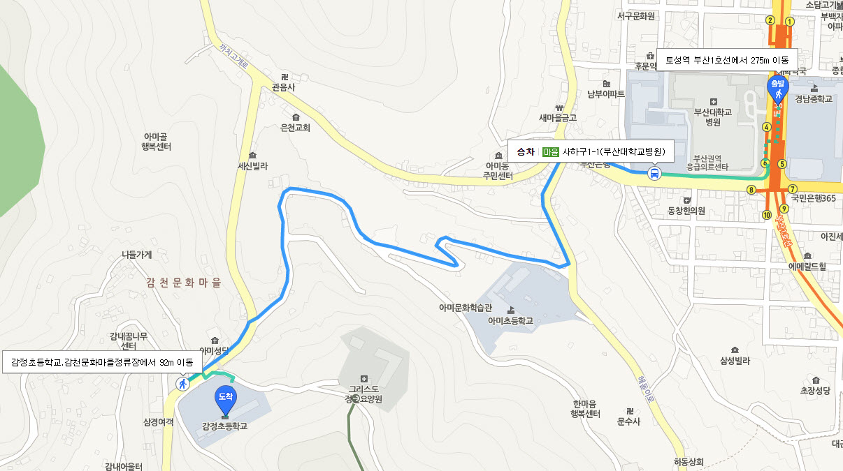 - นั่งรถเมย์เบอร์: 1-1, 2 หรือ 2-2 ไป 10 ป้าย ใช้เวลาประมาณ 12 นาที ก็จะมาถึงโรงเรียนประถมกำชีอง (감정초등학교)