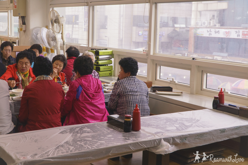 จบเรื่องราคา มาถึงขั้นสุดท้าย ขั้นนี้ต้องใช้ภาษาเกาหลีกันละ คือขั้นตอนของการบอกเจ้าของร้านว่า ให้เอาอาหารสดที่เราพึ่งซื้อไปนั้นไปทำอาหารประเภทไหน สำหรับเรา เรียนมา 2 คำ อย่างแรกคือ จิเกะ คือเอาไปต้ม ถ้าอยากได้แบบเผ็ดก็เติม กิมจิไปข้างหน้าเป็น กิมจิจิเกะแล้วชี้ไปที่หอย (ที่เลือกมา ) คำที่ 2 ไม่ใช่ภาษาเกาหลี แต่เค้าก็เข้าใจ ก็คือ ซาชิมิ พูดแล้วก็ชี้ไปที่ปลาที่เลือกมา เลือกเสร็จก็เดินไปข้างบน ชั้น 2 จะเป็นร้านอาหาร เค้าก็จะนำอาหารสดที่เราเลือกมา มาปรุงและเสริ์ฟให้