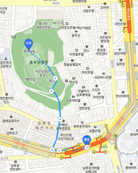 เดินจาก ถนนย่าน Nampodong ไม่ไกล หอคอยปูซานจะตั้งอยู่บนเนิน และเป็นส่วนหนึ่งของสวน Yongdusan
