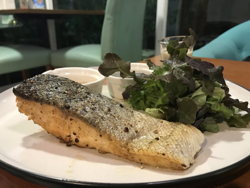 ต่อด้วย "แซลมอนย่างเกลือ" ทางร้านบอกต่างกับสลัดแซลมอนย่าง ตรงที่แซลมอนย่างเกลือจะได้ส่วนหางซึ่งใหญ่กว่า แต่ตอนมาเสิร์ฟก็ดูจะเหมือนๆ กัน สลัดที่เป็นเครื่องเคียงอร่อยดี