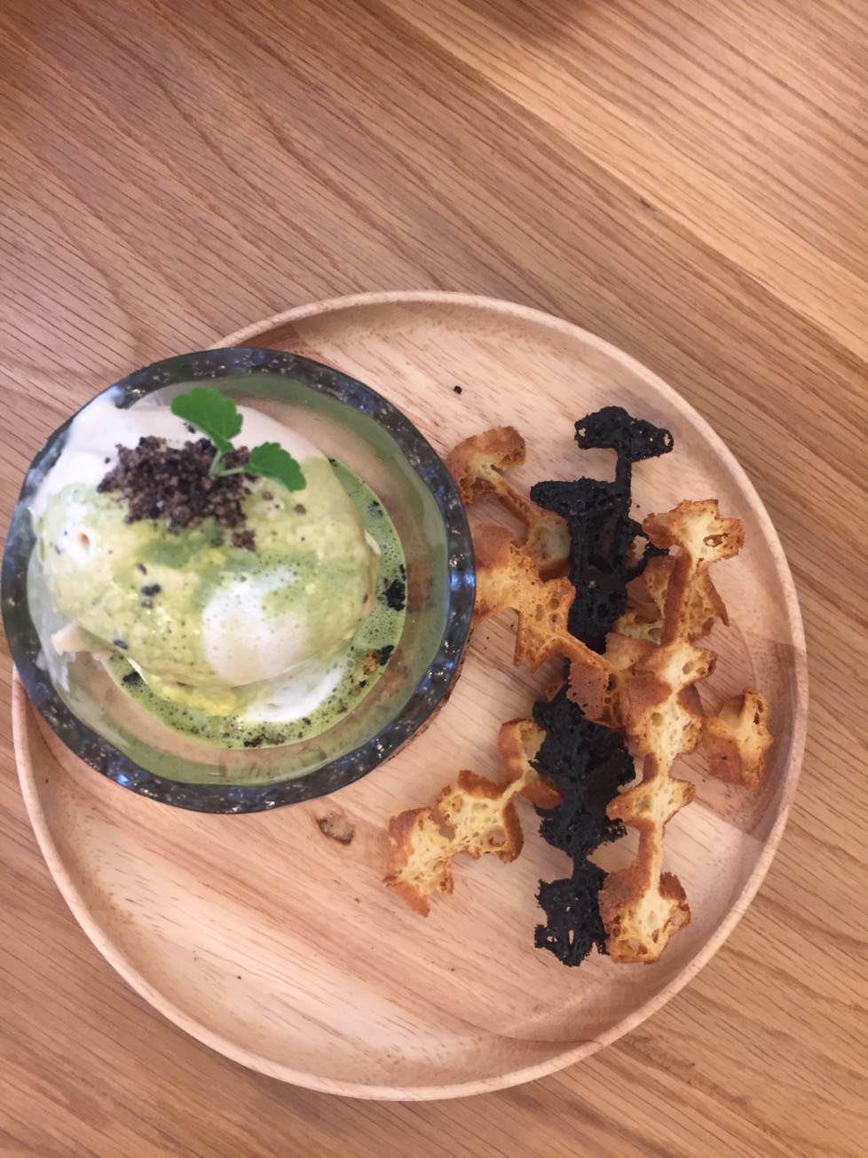 รสคาราเมลอร่อยมาก ไม่หวานจนเกินไป เสริฟ์มากับ ซ๊อสชาเขียว ให้ราดบนไอศครีม ยังไม่พอ ยังมี waffle หั่นเป็นแท่ง อบกรอบ ให้เอามาจิ้มกับไอศครีม เข้ากันดี