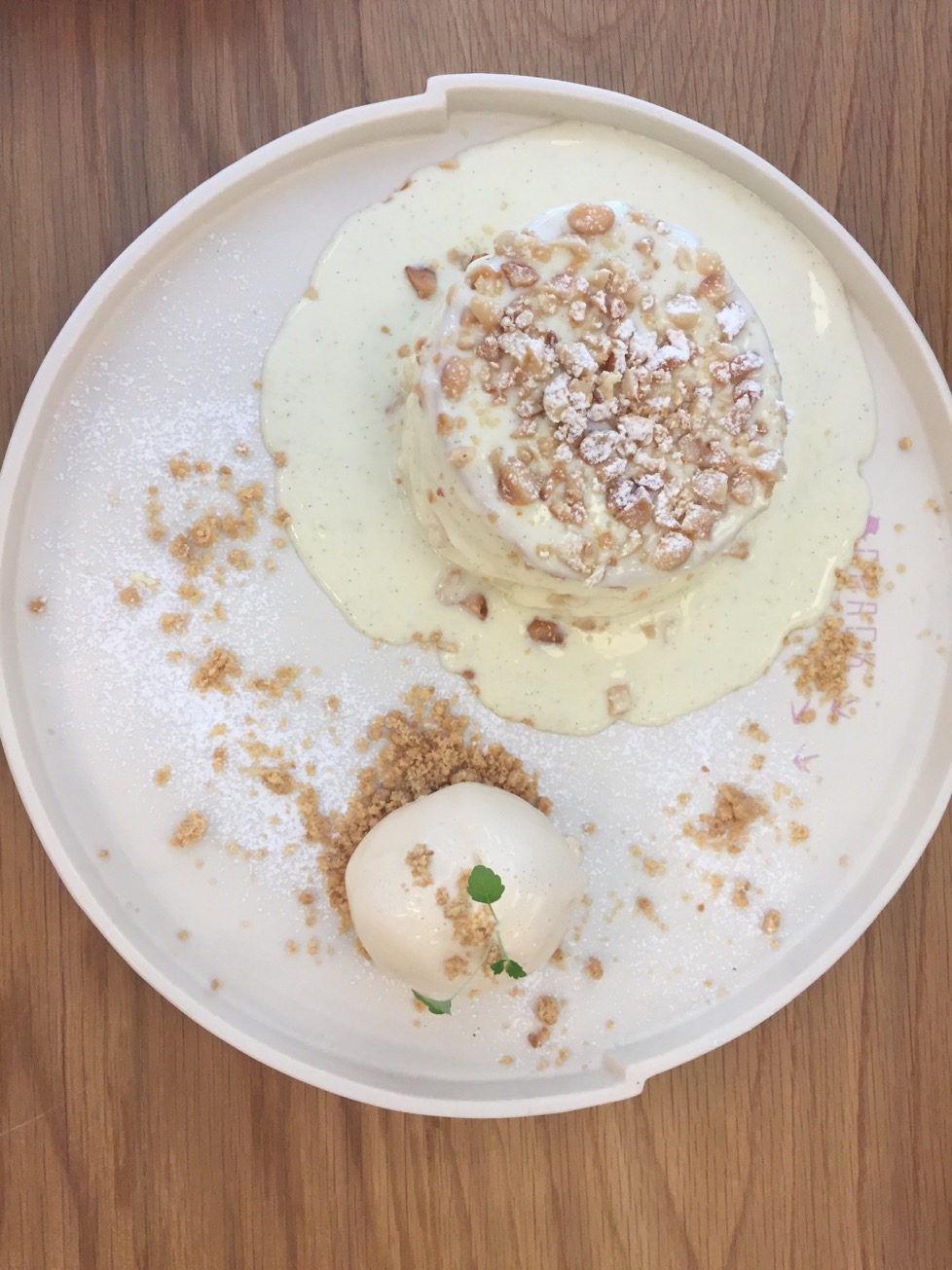โรยด้วยถั่วแมคาเดเมียเยอะมาก พร้อมด้วยไอศครีมคาราเมล กินรวมกัน