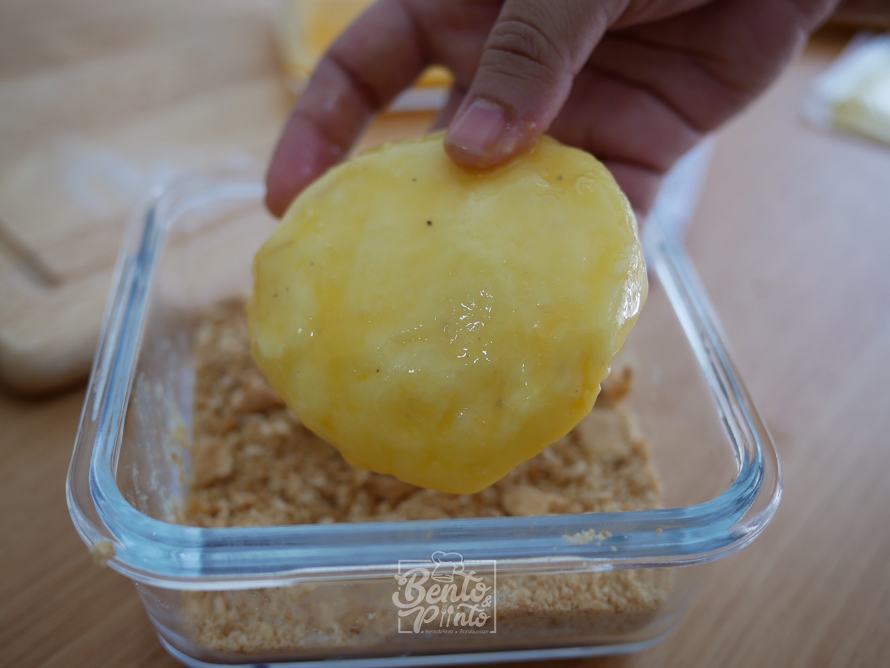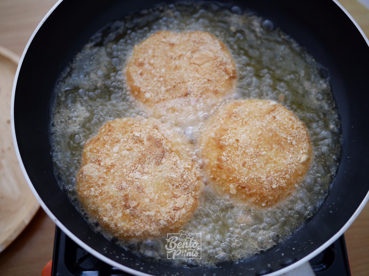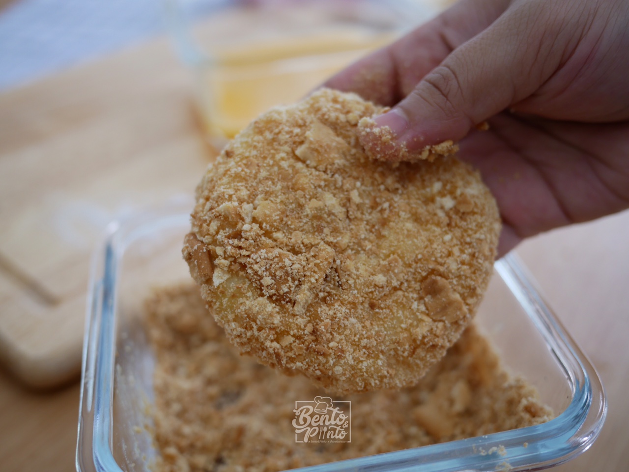 แล้วนำมันบดที่ปั้นไว้มาชุดไข่ และขนมปังอบกรอบที่บดไว้ ให้ทั่วชิ้น