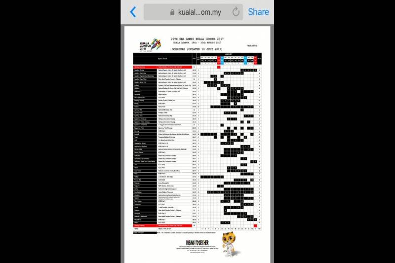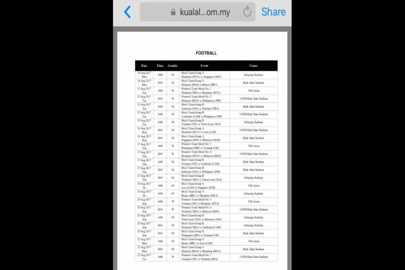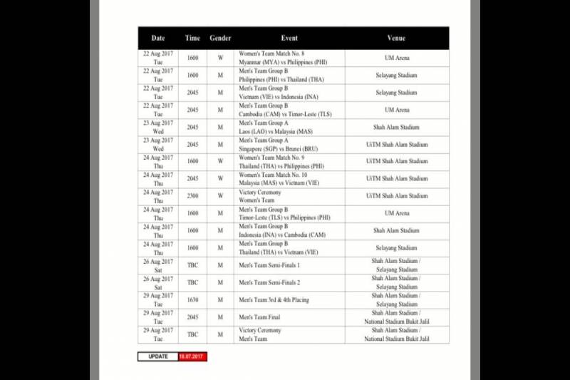 อย่างไรก็ตาม เมื่อเช็กจากเว็บไซต์อย่างเป็นทางการ www.kualalumpur2017.com.my ในช่องโปรแกรมแข่งขัน ยังไม่มีการยืนยันชัดเจน และเมื่อเข้าไปดูในมุมของตั๋วเข้าชม อัพเดตเมื่อวันที่ 18 ก.ค. คิวแข่งบอลชาย กลับไม่เหมือนตามที่เป็นข่าวออกมา จากเปิดสนาม 14 ส.ค. พบ กัมพูชา เปลี่ยนเป็นเริ่มที่ 15 ส.ค. พบ อินโดนีเซีย ส่วนนัดอื่น 17 ส.ค. พบ ติมอร์, 20 ส.ค. พบ กัมพูชา, 22 ส.ค. พบ ฟิลิปปินส์ และ 24 ส.ค. พบ เวียดนาม ขณะที่รอบรองชนะเลิศ เปลี่ยนจาก 27 ส.ค. เป็น 26 ส.ค. เร็วขึ้น 1 วัน