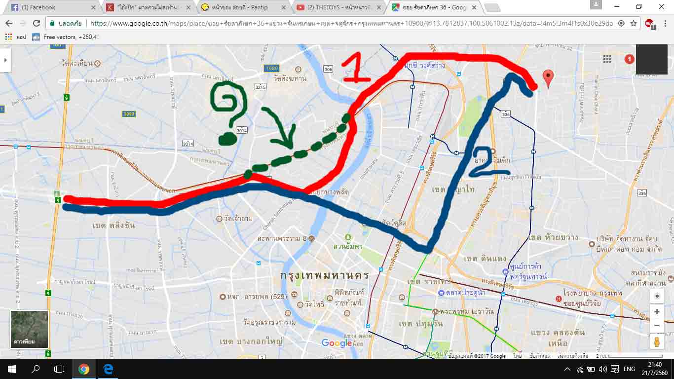 จากภาพ เราจะไป เส้นที่ 1 (สีแดง) หรือ เส้นที่ 2 (สีน้ำเงิน) ดีคะ ขอคำปรึกษาหน่อย