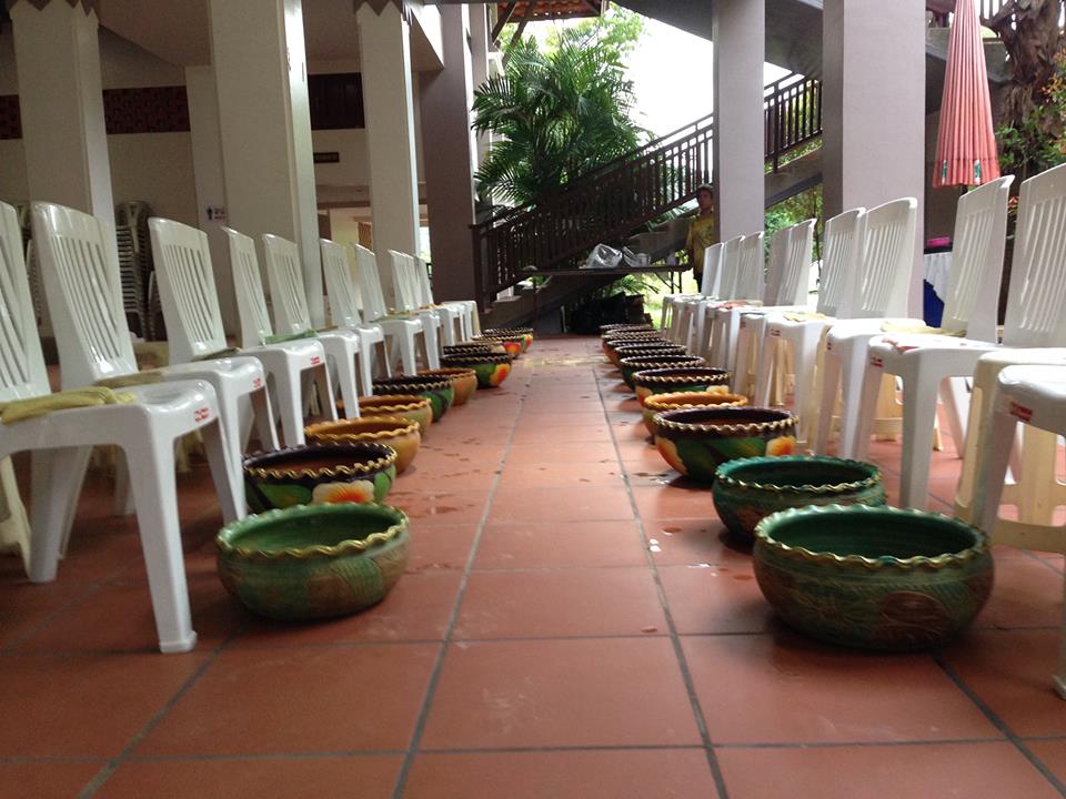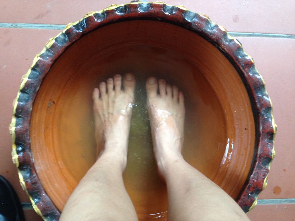 ที่นี่เค้าให้เราแช่เท้าในน้ำร้อนที่บรรจุในโอ่งดินขนาดกำลังดีเวลาแช่เท้า แต่น้ำนี่ ร้อนมากกกก ตอนแช่เหมือนตัวเองเป็นกระดูกหมูที่ต้มอยู่ 555 แต่รอซักพัก น้ำก็จะอุ่นกำลังดี แช่แล้วสบายเท้า สบายตัวค่ะ ที่นี่ใช้น้ำต้มกับไพร ขมิ้น ตะไคร้ ผิวมะกูด แต่เราแอบได้กลิ่นเหมือนมันต้มขิงด้วย สดชื่นดีสำหรับช่วงเช้า เราเรียกว่าเป็นการดีท็อกซ์เท้าละกัน หลักการที่เราเข้าใจจากการศึกษาเองคือ ที่จริงกระแสเลือดน้ำเหลือง และกระแสประสาท ซึ่งทุกส่วนเชื่อมโยงกันหมด โดยเฉพาะเท้า เป็นช่องทางไหลเวียนขนาดเล็กเมื่อเทียบกับร่างกาย โอกาสที่จะอุดตันจากของเสียต่างๆจึงเกิดได้ง่าย หากไม่ขยับขยายช่องทางที่อุดตัน ก็จะส่งผลกระทบต่ออวัยวะต่างๆเป็นลำดับต่อเนื่องกันไป จนส่งผลเสียต่อสุขภาพได้ ปกติบ้านเราจะเอาน้ำอุ่นมาใส่เกลือประมาณ1-2ช้อน แช่ไว้เหมือนกันค่ะ เวลาเมื่อยหรือปวดขา ช่วยให้ผ่อนคลายดี