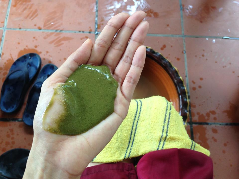 ระหว่างที่แช่เท้าในน้ำร้อน เราก็ใช้เวลาให้เป็นประโยชน์ค่ะ โดยการพอกหน้าด้วยสมุนไพร วิทยากรเดินมาเทน้ำที่ข้นเหมือนครีมสีเขียวประหนึ่งวาซาบิ แต่กลิ่นนี่ต้องเบือนหน้าหนีให้คนละ 2 ช้อนโต๊ะ ส่วนประกอบหลักที่จำได้ของเจ้าสิ่งนี้คือ ถั่วเขียว ข้าวกล้องงอก ไพล เสลดพังพอน ไม่แปลกใจที่กลิ่นนี่ถึงกับเบือนหน้าหนี แต่ก็หนีไม่ได้ค่ะ เพราะต้องพอกเข้าไปทั้งหน้า T^T อันนี้ วิทยากรเล่าว่าจะช่วยดึงพวกสารเคมีตกค้างจากเครื่องสำอางออกมา ช่วยบำรุงผิวหน้าให้ผ่องใส เพิ่มคอลลาเจนจากธรรมชาติ ฟังสรรพคุณแล้วก็ลืมกลิ่นไปเลยค่ะ 5555 พอกทิ้งไว้ 10 นาที รอจนมันแห้ง ก็ล้างออก ที่จริงสัมผัสมันเหมือนสครับเลย เอาไปขัดๆถูๆหน้ากับตัวได้เหมือนกัน (ขากลับเลยซื้อสูตรพกไปทำเองที่บ้านกลับมาซอง เอาไปผสมโยเกริตพอกหน้าท่าจะฟินอยู่)