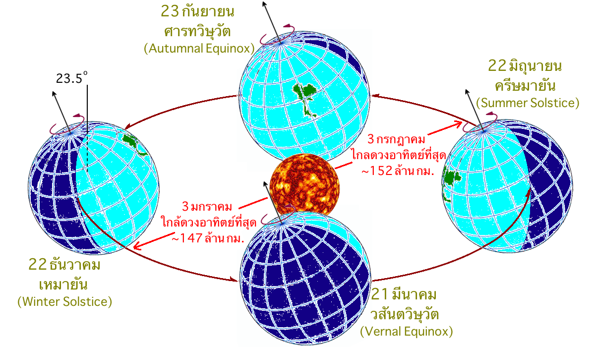 ในช่วงฤดูร้อน โลกจะหันซีกโลกเหนือในบริเวณประเทศไทยเข้าหาดวงอาทิตย์แบบเต็ม ๆ (เมษายน พฤษภาคม)