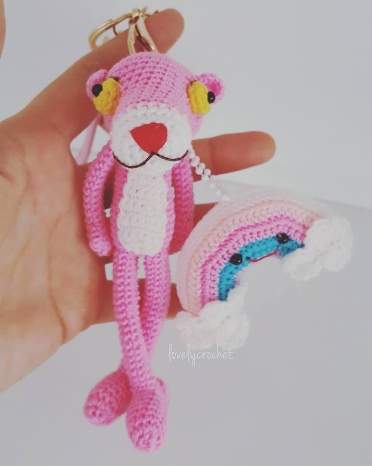 พวงกุญแจพิงค์แพนเตอร์ ถักจากไหมคอตต้อนซัมเมอร์ มันเงา มาพร้อมสายรุ้งน่ารัก