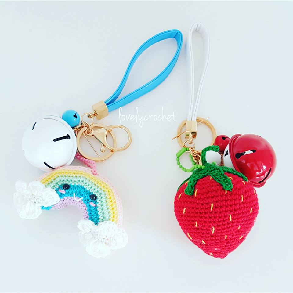 พวงกุญแจรุ้งกินน้ำ และ สตอร์เบอร์รี่ น่ารักมากๆ นะคะ ถักจากไหมซํมเมอร์