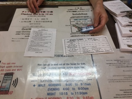 ผมแจ้งชื่อให้กับเจ้าหน้าที่ และก็ได้กุญแจห้องมาพร้อมจ่ายเงินค่าห้องไป 2,100 เยน (ประมาณ 630 บาท) ตามปกติแล้วที่นี่จะให้เช็คอินหลังบ่ายสอง แต่เผอิญวันที่ผมมาถึงประมาณ 8.30 น. ห้องว่างพอดีก็เลยขอเข้าได้พักเลย ห้องพักที่ได้คือห้อง 807 ครับ เป็นห้องสไตล์ญี่ปุ่น เปิดเข้าห้องก็ตะลึงเล็กน้อย แต่โรงแรมญี่ปุ่นก็จะประมาณนี้ครับ ขนาดเล็ก กะทัดรัด ผมเข้าห้องมาวางของ เปลี่ยนเสื้อผ้า นอนพักสักแป๊ปก่อนไปลุยต่อข้างนอก