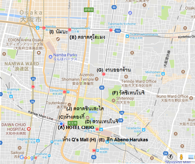 ตลาดสดคุโระมง (Kuromon Ichiba) → สวนเทนโนจิ → ชมวิวตึก Abeno Harukas → วันชิเทนโนจิ → นัมบะ