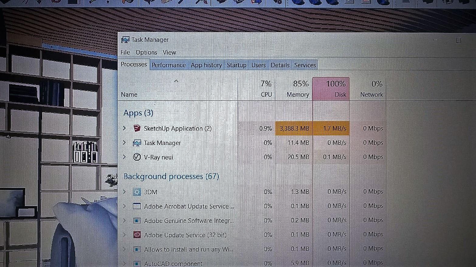ขอเกริ่นก่อนนนะครับว่า ผมเรียนเกี่ยวกับ สถาปัตย์ครับ ต้องปั้นโมเดล 3D นั่งเรนเดอร์ แต่เมื่ออาทิตย์ที่ผ่านมา ผมนั่งเรนเดอร์งานอยู่ แต่คอมมันกระตุกมากครับ กระตุกแบบว่า (นี่คอนโดห้องเดียวนะเนี่ยยยย) จะปิด Chrome ยังต้องรอ 5 นาที เลยครับ เลยคิดว่าจะอัพคอมให้มันทำงานคล่องกว่านี้ซักหน่อย พอกดดู Task Manager ก็เห็น แรม กับ ฮาร์ดดิสก์ ทำงานกันตาเหลือก แรมนี่หอบ- วิ่ง 80-90% ตลอด ส่วน ฮารด์ดิกส์นี่กระอักเลือดปางตาย TT^TT วิ่ง 100% ไม่ลงเลยครับบ ตามภาพครับ