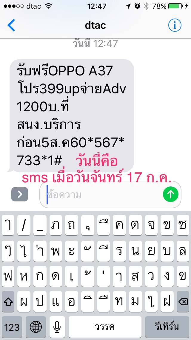 พอดีทำเรื่องย้ายค่ายไป ais เมื่อวันที่ 15 ก.ค.ที่ผ่านมา แล้วได้รับการติดต่อจาก dtac เมื่อ 17 ก.ค. ว่าถ้าไม่ย้ายจะได้รับ oppo a37 ใช้แพคเกจ 399 บาทสัญญา 1 ปี ผมได้คุยก็ตอบตกลงไป ( มีsms แจ้งรับเครื่อง )