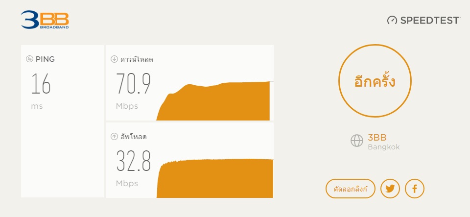 สวัสดีค่ะ รบกวนสอบถามเพื่อนๆ พี่ๆน้องๆทุกท่านนะคะ พอดีเดิมใช้เน็ตของ 3BB อยู่แล้วค่ะ ใช้มานานมากกกกกกกก เจอปัญหาบ้างนิดหน่อยแค่สองสามครั้งตลอดอายุการใช้งานที่ผ่านมา ADSL สรุปโดยรวมก็ถือยังว่าพอใจในบริการอยู่ แต่พอเมื่อหลายวันก่อนเห็นโปรโมชั่น 3BB Fiber 100/30 สนใจ และทำการเปลี่ยน จนวันนี้ช่างมาติดตั้งให้เรียบร้อยแล้วค่ะ ดิฉันได้ทำการ Speed test แต่ความเร็วมาไม่ถึงเลยค่ะ ตามรูปเลยค่ะ แต่บางทีตกยิ่งกว่านี้นะคะ อันนี้คือดีที่สุดเท่าที่เทสมาล่ะค่ะ จึงโทรแจ้งไปศูนย์ เค้าก็แจ้งว่าจะให้ช่างเค้ามาดูระบบให้อีกทีนึงค่ะ