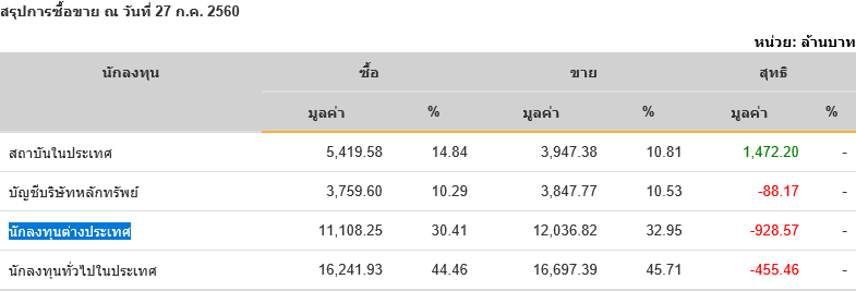 Sinthorn Summary 27/7/2560 : ต่างชาติขายสุทธิ -928.57 ลบ.