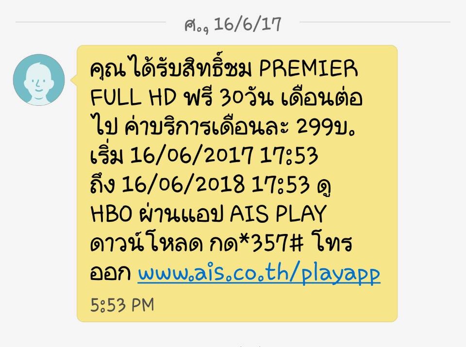 ผมเปิดเบอร์ใหม่กับ AIS เมื่อเดือนมิถุนายนที่ผ่านมา ซึ่งมีจดหมายเชิญชวนส่งมาหาลูกค้า AIS Fibre สามารถเปิดเบอร์ใหม่ แพ็คเกจ 299 โทร 250 นาที โทรเบอร์พิเศษ 1 เบอร์ เน็ต 12 GB พร้อมรับชมฟรี Premier Ful HD 1 เดือน ซึ่งผมเห็นว่าแพ็คเกจคุ้มค่า จึงยอมปิดเบอร์เก่าและเปิดเบอร์ใหม่ และแล้ววันที่ 16 มิถุนา ผมก็ได้รับ SMS ให้ดูฟรี Premier Ful HD 1 เดือน เริ่ม 16/06/17-16/07/17 ซึ่งจากใน SMS ผมคิดว่าวันที่ 16 กรกฏา ระบบจะยกเลิกให้อัตโนมัติ แต่คุณสมัครบริการให้ผมต่อ แล้วก็มี SMS แจ้งมาในวันที่ 17 ตอนสายๆ ว่าคิดค่าบริการ 299 แล้วนะ เห้ยยย อะไรกัน คุณบอกให้ผมดูฟรี 1 เดือน คุณก็ต้องให้ผมแค่ 1 เดือนสิครับ หากลูกค้าต้องการดูต่อควรแจ้งให้ลูกค้ากดยืนยันสมัครใหม่ ซึ่งผมเองก็เพิ่งมารู้ตัวในวันที่ 27 ซึ่งเลยมากว่า 10 วัน ผมยอมรับว่าผิดที่ไม่ได้ตรวจดู SMS ให้ละเอียด บางทีก็เปิดอ่านผ่านๆตา และวันนี้ผมโทรขอยกเลิกกับคอลเซ็นเตอร์ กลับแจ้งผมว่าให้ยกเลิกในวันตัดรอบบิล คือวันที่ 15 ยกเลิกวันนี้ยังไงก็ต้องจ่าย 299 ตรงนี้ผมว่ามันไม่ใช่แล้วครับ คุณสมัครให้ผมอัตโนมัติแต่ผมขอยกเลิกให้มีผลทันทีกลับคิดเต็มจำนวน แล้วบังคับให้ใช้งานจนถึงวันตัดรอบบิล แบบนี้คือการเอาเปรียบผู้บริโภคครับ ผมร้องเรียน กสทช. เบอร์ 1200 แจ้งว่าพรุ่งนี้ผมจะส่งเอกสารทางอีเมลล์เพื่อร้องเรียนครับ แล้ว AIS จะช่วยผมยังไงได้บ้างครับ ค่าบริการ 299 ที่ผมไม่ต้องการสมัครบริการ ในส่วนค่าบริการผมไม่ซีเรียสครับ แต่คุณไม่ควรหาโอกาสเอาเปรียบลูกค้าแบบนี้